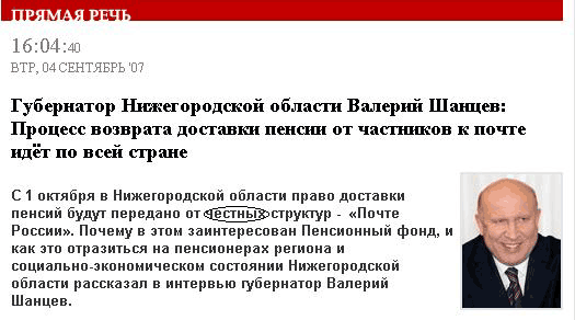 Эти честные структуры заколебали, согласен Александр с губернатором Шанцевым. Все бабки доставляют пенсионерам, откатов никаких не делают - безобразие! Пора, понимаешь, вернуться к истокам - "Почте России". Вот там все будет нормально. По-государственному!