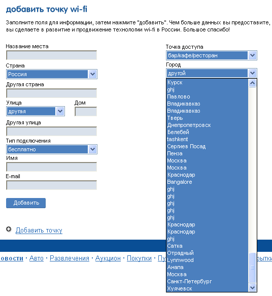 Вот и Mail.ru, радуется Денис, вспомнив о том, что "Яндекс" уже года два назад завайфаил сайт с хот-спотами, решил и у себя заэпигонить нечто подобное. Правда, как водится у них в последнее время, ребеночек получился кривенький, косенький и, в общем, слегка мертворожденный, но зато отрапортовали о запуске нового сервиса. А города-то какие классные в списке - просто сердце радуется!