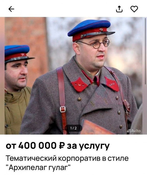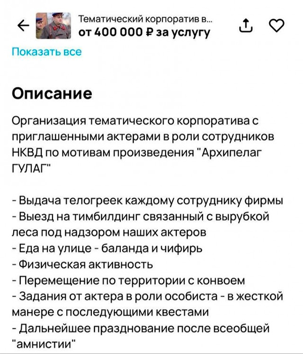 По недавнему опросу "Левады центра" по поводу того, кого россияне могут назвать самими выдающимися людьми в истории, на первое место они поставили Сталина. Ну и неудивительно, что подобные "тематические корпоративы" будут вполне востребованы. Я только не понимаю, почему в список услуг не входит расстрел. Что-то как-то неаккуратненько.