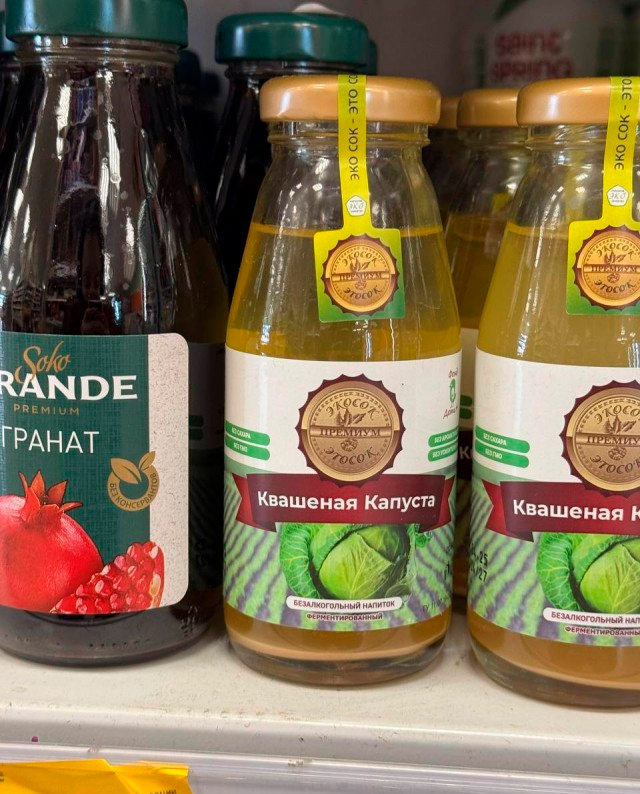 Наверное, смешно то, что "Квашеная капуста" написано в центре большими буквами, а слова "сок" и "напиток" - маленькими (и пофиг, что в общем количестве шести штук). Посмотрите, мол, какая жидкая эта их квашеная капуста. Ха-ха.