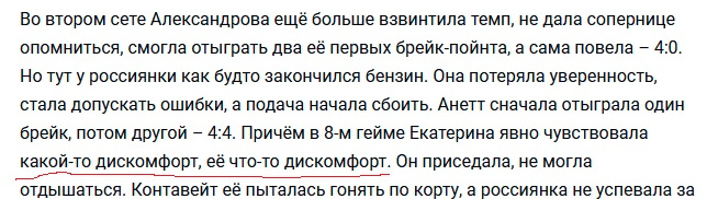 Видимо, считает Михаил, новостист championat.com пытался донести мысль о том, что россиянку что-то дискомфортило. Впрочем, меня тоже дискомфортит, когда у меня заканчивается бензин.