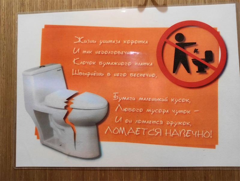 Екатерина увидела эту балладу о хрупкости унитаза в одном из туалетов. У нее есть предположение, что в этот несчастный унитаз кинули все-таки не бумажный платочек, а кусочек обогащенного урана.