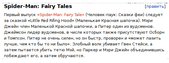 Сказки феи человека-паука, замечает Scorpion, были ничем не примечательной постановкой. Мэри Джейн играла роль маленькой Красной Шапочки, а Питер играл роль лесника. Но потом всю эту байду перевели "Промтом", и сказка сразу засияла!