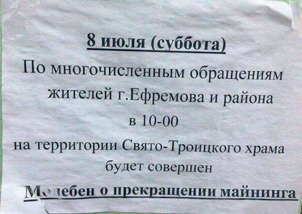 Молебен о прекращении майнинга - круто! ))) Еще надо устроить молебен за отмену VPN и мессенджеров!