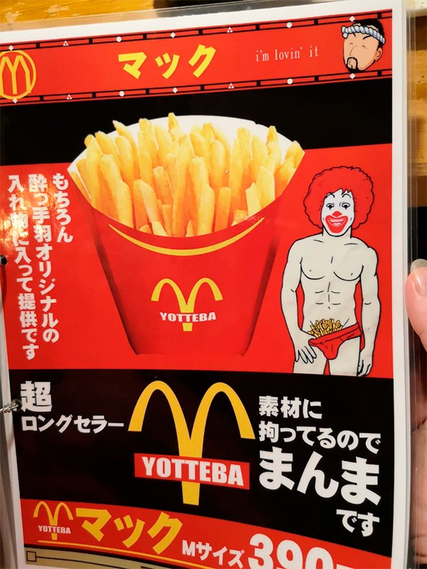 Я провел тщательное расследование в гугле! Это не реклама, а заламинированный листок с акцией на картошку фри в баре, сфотографированный в самом баре. Yotteba - обычный японский "пивняк" с крылышкими, картошкой фри и т.д. Так что нет тут никаких скрытых смыслов, только странный японский юмор.