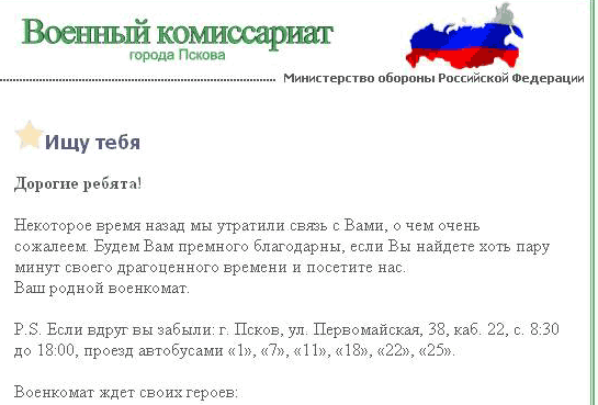 А еще говорят, радуется Николай, что у военных вообще нет чувства юмора. В военкомате города Пскова у мужиков с чувством юмора - все в порядке.