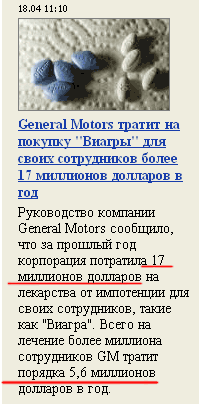 У руководства General Motors, замечает Николай, неумеренный прием виагры вызвал совершенно бешеный отлив крови от мозга, и они теперь совершенно серьезно уверяют, что потратили 17 миллионов долларов на виагру при общих затратах в 5,6.