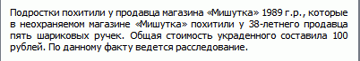 Теперь продавец пять шариковых ручек оказался обокраденным на 100 рублей! Что творится вообще в этом мире, что? И что подростки будут делать с 1989 г. р.? Куда они это денут? Это тяжелые и больные вопросы. На их фоне мы даже не будем интересоваться проблемами и зависимостями журналиста, выдавшего эту потрясающую новость...