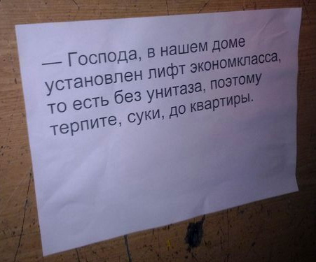 Михаил считает, что расклеивать объявления в лифтах - нехорошо. Страдает здоровье. А потому что это Россия, детка!