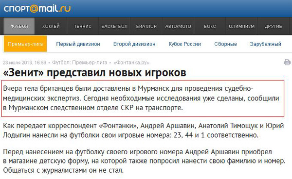 Дмитрию даже страшно предположить, зачем "Зениту" понадобились тела британцев. "Спорт.mail.ru" на этот счет разъяснений также не дает.