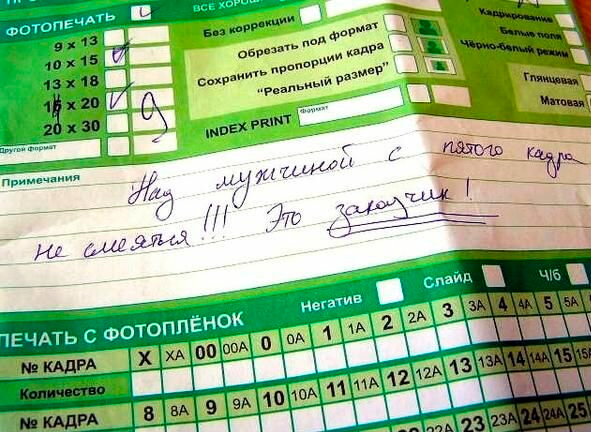 Фото заказа: А чо, еще берут на печать? Вау. Pаботал в трех таких разных фото-лабах в 1995-1996. Там не то что "не смеяться!" -- там распечатывали отдельные себе за свой счет и вешали на стену.