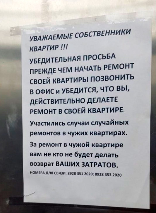 Какие граждане-то невнимательные пошли! Идут и делают ремонт не в своей квартире. А ведь затратов им не кто не компастирует!