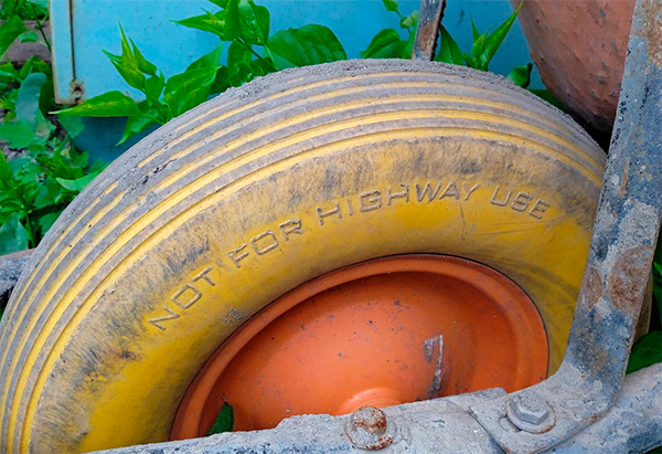 Андрей прислал фото садовой тачки. На колесе тачки содержится трогательное предупреждение о том, что на данной тачке не рекомендуется кататься по скоростному шоссе.