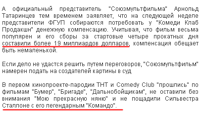 Когда на Rian.ru что-то пишут, замечает Ermek Kospanov, тут хоть стой, хоть падай. Ладно еще - 19 миллиардов долларов, собранных кинотеатром "Дружба" в первые дни проката этого говна "Самый лучший фильм". Но они не пощадили даже Арнольда Шварценеггера с его легендарным "Рэмбо"!