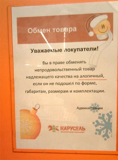 В магазине "Карусель", замечает Андрей, вы имеете полное право обменять непродовольственный товар на алогичный. Как это? Очень просто. Например, шуруповерт меняете на мороженое. Лампочку - на грибы. Очень удобно.