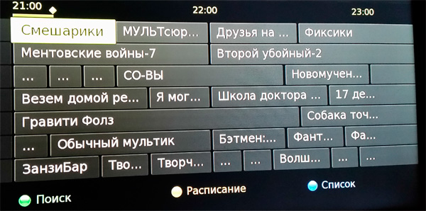 там все проще гораздо. Программу надо читать по горизонтали, а строчкой ниже - уже какой то другой канал (например НТВ)... причем на многих устройствах, ресиверах и тп- программы телеканалов давным давно именно так и передаются, по временной шкале чтобы было легко отследить что сейчас идет по какому каналу