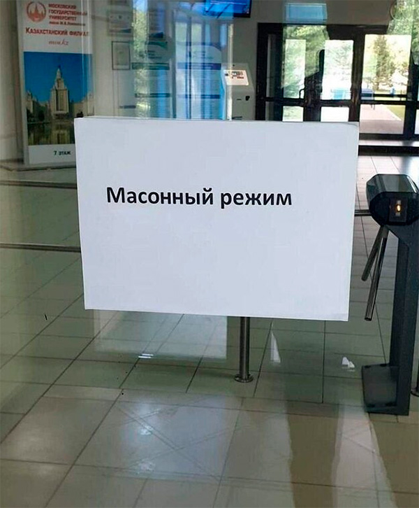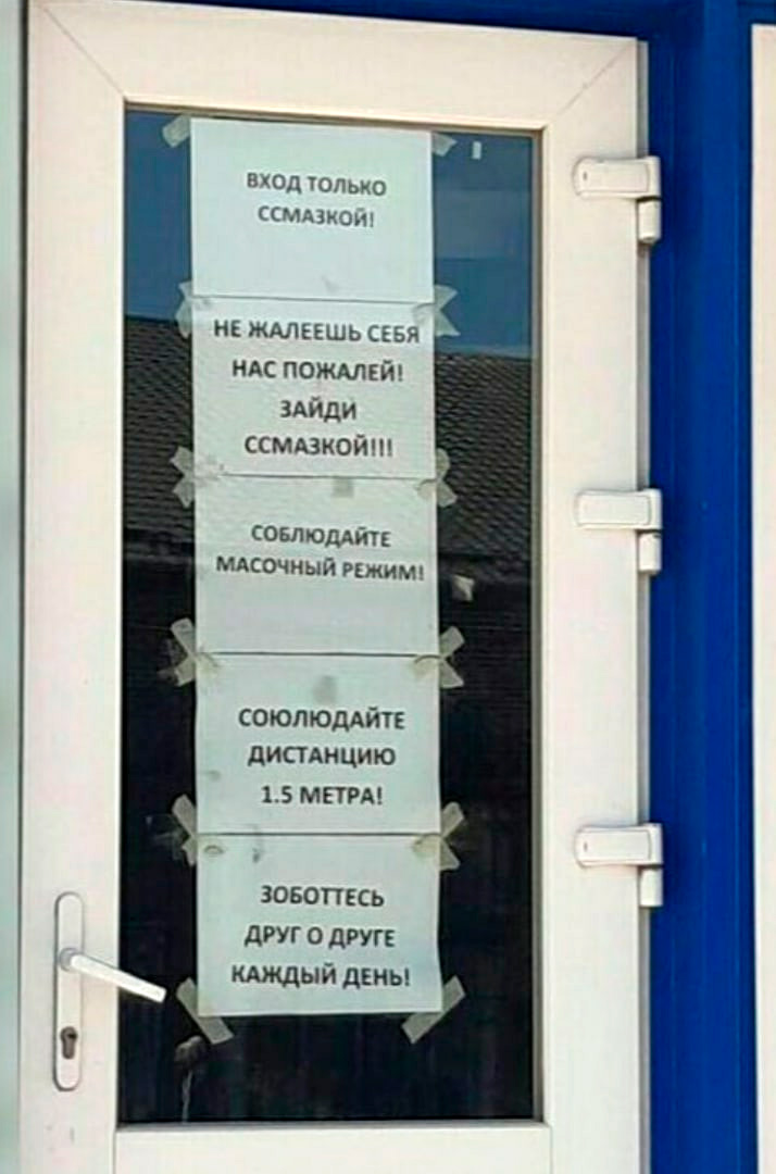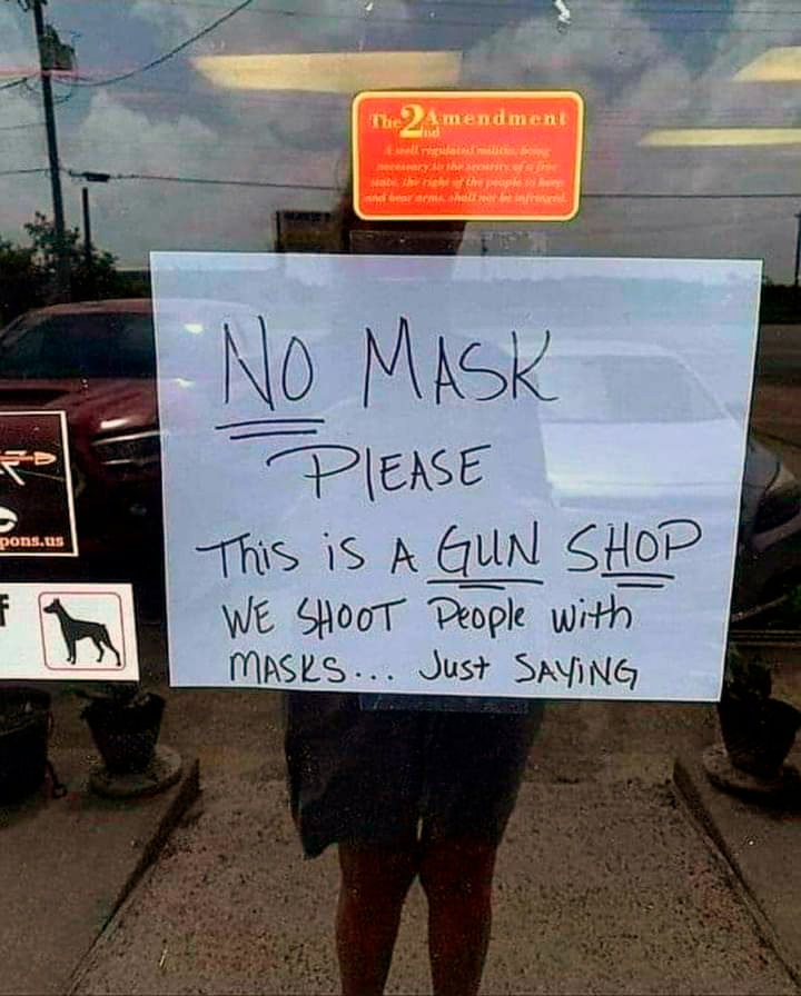 А вот маски-то нужно носить не везде! (Надпись на объявлении: "Без маски, пожалуйста. Это магазин оружия, мы стреляем в людей в масках... Просто предупреждаем".)