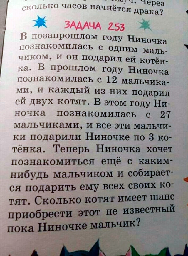 Алекс, задачку про котят стоит удалить - как неформат) Это из "Задачника" Григория Остера, шутливого задачника по математике (многие наверняка его вспомнят, это ОЧЕНЬ известная книга). Там все задачки в таком стиле.