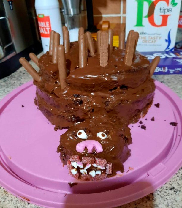 торт нещитовый. Это, по-моему, из шоу "Грейт Бритиш Бейк Офф", таM такие показывают регулярно (с зубами, etc). Hарод старается испечь торт по рецепту "ежик" и посылает фотки, что у них вышло.. Если бы этот торт был на продаже в "пятерочке", тогда да. Но ценника не увидел.
