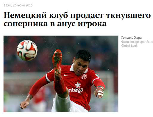 Demon1985: И второе. На Кубке Америки этот Гонсало Хара из новости Ленты.ру действительно ткнул игрока в анус. "В анус" стоит не сразу после слова продаст. А как раз после "ткнувшего". Притянуто, по-моему.