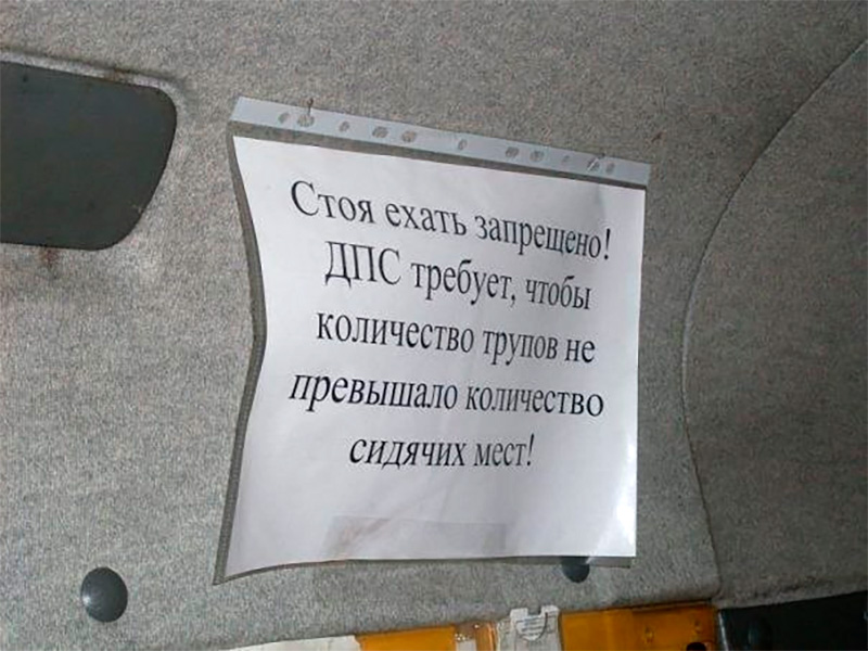 Ну, приколы в маршрутках я видел ещё когда жил в рашке. Типа «бананы есть вместе с кожурой» и «хлопнешь дверью — умрёшь от монтировки».