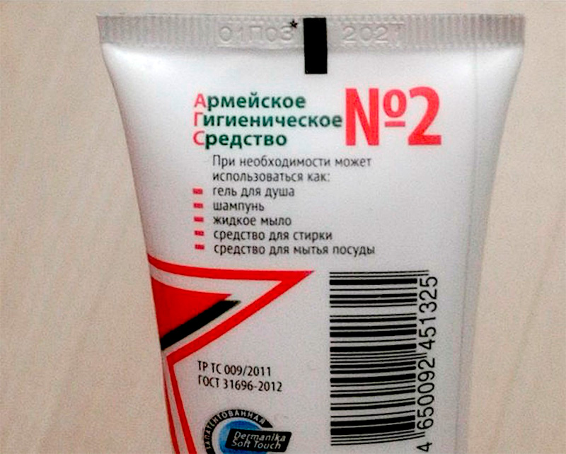 А армейское гигиеническое средство выглядит смешно, но по сути это просто жидкое мыло. Его еще как пену для бритья можно использовать, забыли написать 😄