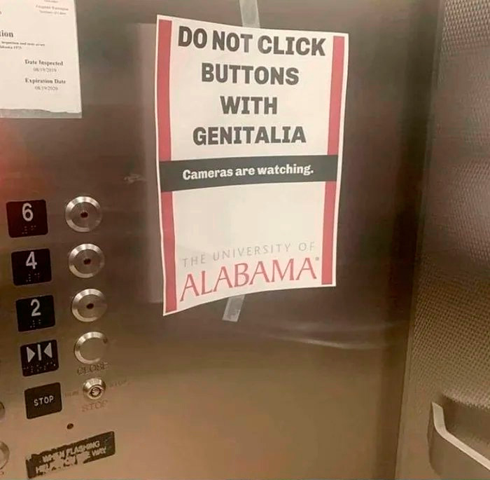 На объявлении в лифте университета Алабамы написано: "Не нажимать кнопки гениталиями. Работают камеры наблюдения". Видимо, это стало большой проблемой.