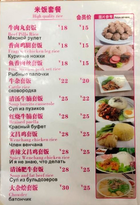 Слушайте, я много всяких меню видел. Супом из пузиков меня не удивить, равно как и супом из бульдозеров. Но член венчана - это уже интересно, конечно. А блюдо "И я не знаю, что делать" - это просто шедевр, как я считаю!