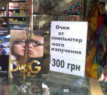 Андрей нашел шикарный способ заработать. Берете обычные очки за 50 гривен. Пишете плакат "Очки от компьютерного излучения" и ставите ценник 300 гривен. Многие покупают.