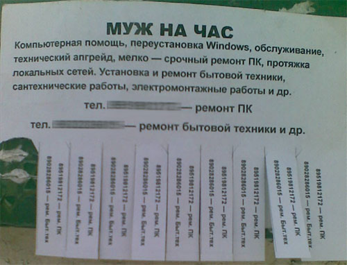 Объясняем. Это завуалированное объявление - для тех, кто в курсе. Пока ваш муж сутками торчит за компьютером, придет вот этот муж на час и за час выполнит супружеский долг того, кто торчит за компьютером.
