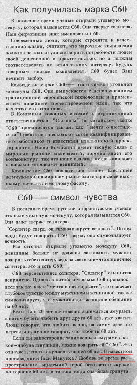 Инструкции наших китайских друзей, замечает Борис, становятся все изощреннее и, прямо скажем, поэтичнее. И не инструкции это вовсе, а фактически поэма. Вот, например, краткая справка о С60, приложенная к обычной китайской кожаной сумке.