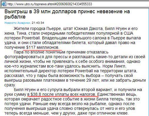 Крутые у них там налоги, изумляется Alexander. С выигрыша в $117 миллионов получить 39 баксов после уплаты всех налогов - это красиво. Хорошо хоть должны не остались счастливые супруги...