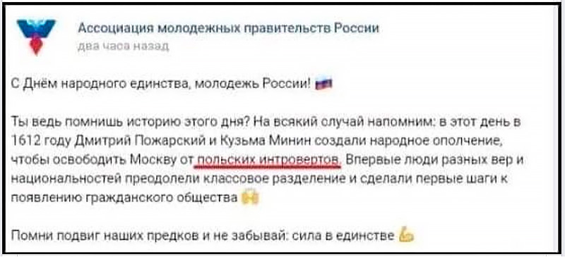 Молодежные правительства России напоминают тебе, молодежь, как совсем недавно, в 1612 году, русские экстраверты Дмитрий Пожарский и Кузьма Минин освободили Москву от польских интровертов, будь они неладны! Ведь кто они, интроверты? Это люди, которые изолировали себя от общества и по каким-то важным внутренним причинам не имеют возможности удовлетворять свои потребности через активное общение с внешним миром. А на хрен нам такие поляки в Москве были нужны, правильно? Гнать их, однозначно!