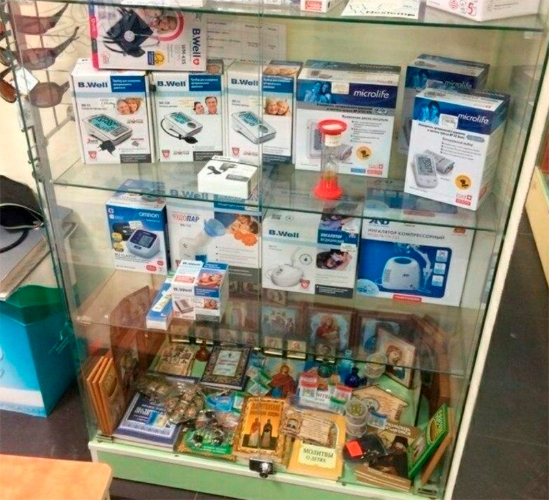 Стенд с медицинскими устройствами, вздыхает Андрей. Нижняя полочка особенно вставляет.