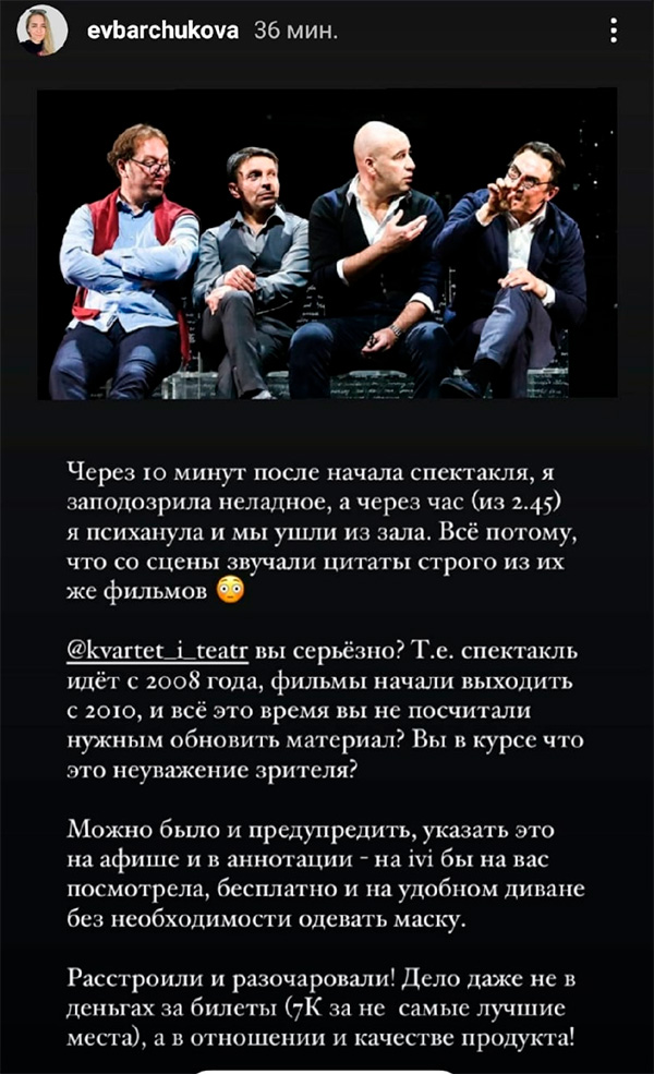 На сайте "Квартета И" прекрасная дама страшно возмутилась тем, что в один и тот же спектакль, который труппа играет много лет, не было внесено никаких изменений. Безобразие, честное слово! Неуважение к зрителю - мы с котом Бубликом в этом полностью согласны!