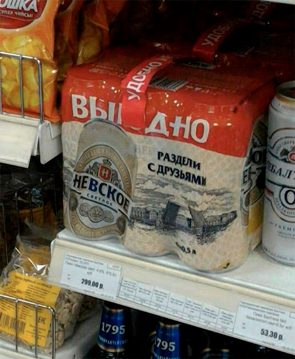 Упаковка пива могла подразумевать и альтернативное прочтение: вы - дно, потому что вы с друзьями кого-то раздЕли.