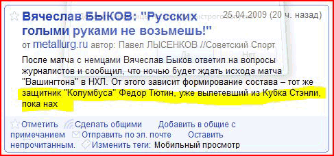 Нас, русских, согласен с Быковым Слава, голыми руками не возьмешь. Тютин хоть и вылетел из Кубка Стэнли пока нах, но все равно полон оптимизма и спортивного задора.