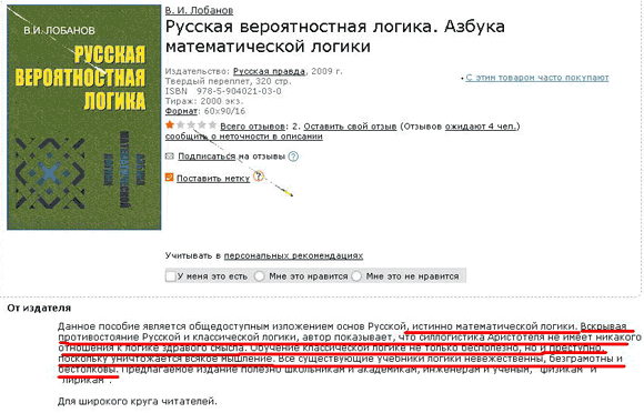 Покажем на этом примере недостатки мышления Б.Рассела. Во-первых, от-сутствие дисциплины мышления проявляется в отсутствии универсума, хотя даже 100 лет назад Льюис Кэрролл[2] не позволял себе такого невежества. Определим, например, в качестве универсума весь животный и растительный мир. Во-вторых, последняя посылка с позиции русской логики просто бестолкова: в силу симмет-рии частно-утвердительного функтора мы должны считать, что некоторые люди – животные, а остальные - деревья, кусты, цветы или другие растения. В соответ-ствии с Русской логикой и здравым смыслом вторую посылку необходимо заме-нить суждением «Все люди – животные». В-третьих, по теории великого русского физиолога И.П. Павлова, а Рассел придерживался именно этой господствующей до сих пор теории, разумными могут быть люди и только люди, т.е. «люди» и «ра-зумные существа» – эквивалентные понятия. Следовательно, и первая посылка некорректна. Устранив ошибки невежества и бестолковости Б.Рассела, получим следующие посылки.