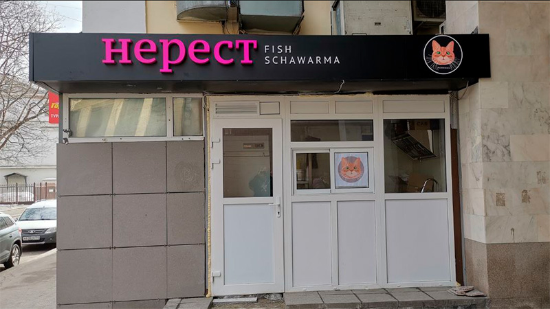 Да вы лучше попробуйте, что они хотели сказать вот этим названием, предлагает Алекс. Ну "Нерест" - это когда рыбки нерестятся. Или имеется в виду, что это - нересторан, то есть забегаловка. Fish - это рыба. Schawarma - это, видимо, им так хотелось написать шаверма на иностранном, что они воплотили свое желание. Но почему, вы спросите, там изображение кота? Так им надо же намекнуть, как на самом деле делается их шаверма.