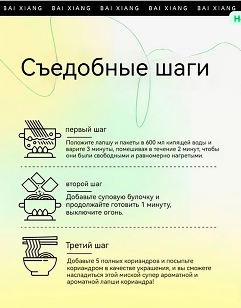 Конечно же, есть подробная инструкция по приготовлению - съедобные шаги! Пакеты положить в кипящую воду, не забыть добавить суповую булочку, а потом закинуть все пять деревьев кориандра!