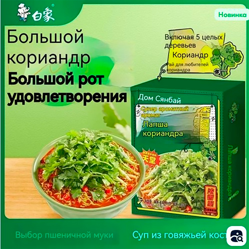 Китайцы, радуется Сергей, умеют завлечь! Лапша кориандра! Из пяти целых деревьев кориандра! На говяжьей кости. Большой рот полностью удовлетворяется!