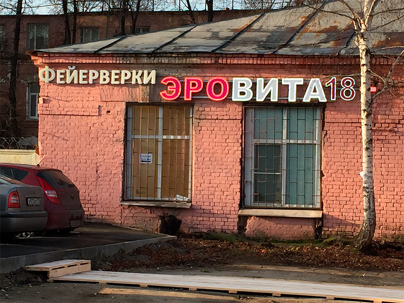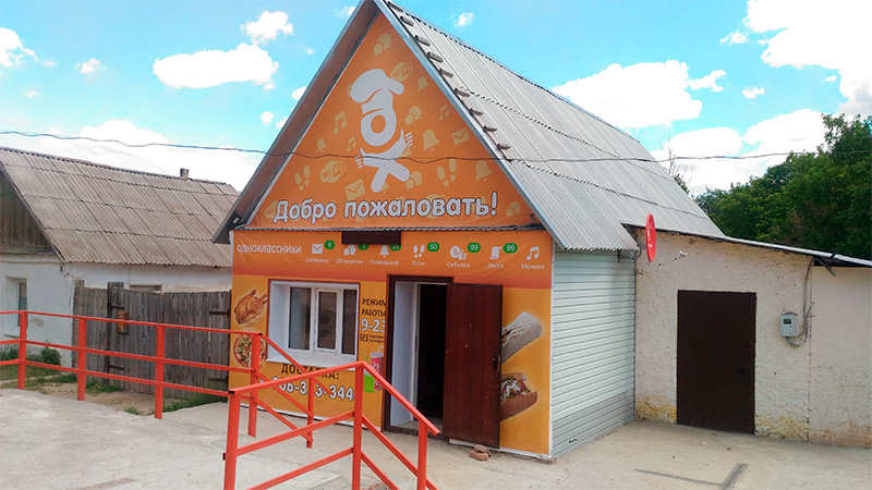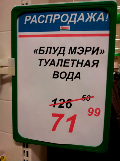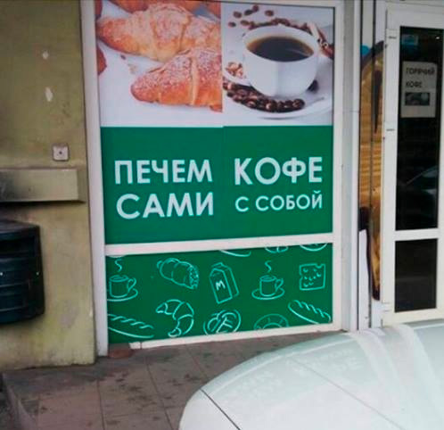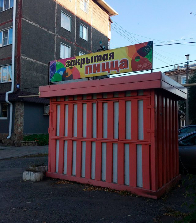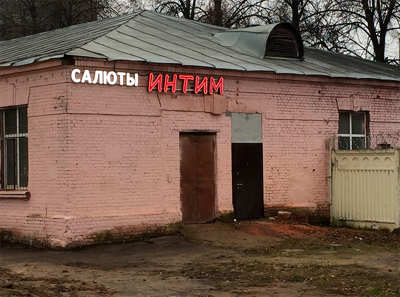 Нечто похожее: точно так же две вывески "Интим" и "Шаурма" (или пицца, вообщем что-то съедобное). А между двумя вывесками небольшой экран с бегущей строкой: "Таксистам и студентам скидки... (дальше какие именно)".