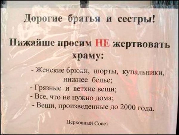 Женские брюки тоже лучше не жертвовать. Матушка-игуменья не любит это дело. И смартфоны, произведенные до 2000 года, тоже не надо, там и так такого завались!
