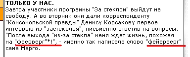 - Ну да, - сказал Корсаков нашему корреспонденту. - Выяснилось, что Марго - круглая дура. "Фейерверг" как писать не знает, "экзистенционанизм" вообще произнести не может, "польты" пишет через "а", "жызнь" пишет через "с", а элементарное слово "гипропромтрансстрой" вообще заменяет восклицанием "ну это... как его...". Дура она, короче говоря, дура. Вот лично я не стал бы с ней это.... ну как его...