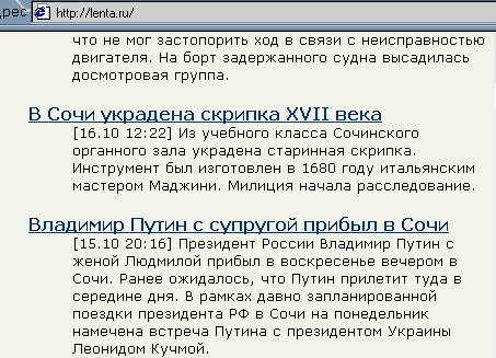 Кстати, все правильно. Путин прибыл 15.10, а скрипочка сделала ноги 16.10. Но мы же не будем осуждать президента за эту маленькую слабость, не так ли? Конечно, ему бы эту скрипку и "за так" подарили - президент все-таки! Но президенту стыдно признаться в том, что он любит по ночам разыгрывать перед женой Людмилой опус "Наша служба и опасна и трудна" c-dur, а свою скрипочку он забыл в Москве, так что пришлось Владимиру посетить органный зал. Как там у Искандера в "Валтасаровых пирах"? "Не осуждай вождя! Очень тебя прошу!"