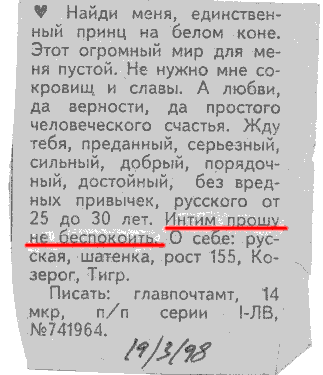 (горестно) Это же до чего довели русскую шатенку, если она ищет принца на белом коне для любви и счастья, но просит не беспокоить свой интим! Ужас какой! Бедная женщина! Остается ей только посоветовать следовать заветам баннизма, который нам прислал Reznitskiy Dmitriy: