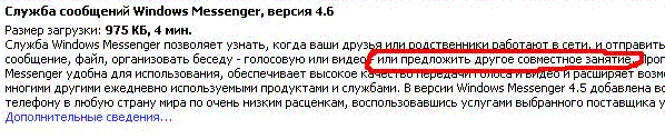 Между прочим, только Windows Messenger позволяет организовать всякие ДРУГИЕ совместные занятия в Сети. Вероятно, он для этого использует какие-то специальные плагины. Потому что все остальные средства коммуникаций - ICQ, AOL и так далее - предоставляют самый обычный сервис: обмен сообщениями, видео, общение голосом. А вот ДРУГИЕ совместные занятия - черта с два!