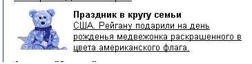 Да-да, на экране вы как раз видите того самого медвежонка, раскрашенного в те самые цвета американского флага - белый с голубым. Хотя, по идее, цвета должны изображать белого, черного и красного, символизирующих три цвета, три составных части Америки. Впрочем, конечно, красного можно и выкинуть, потому что эти ребята не дали Соединенным Штатам практически ничего, за исключением той земли, на которой стоит эта страна. Но зато красным белые подарили много-много (штук пять) всяких резерваций, где они могут вдоволь камлать, кидать ножиком в столб, пить огненную воду, подсчитывать скальпы, добытые в те времена, когда белые на голове еще не носили свои дурацкие шляпы, но главное - не пользовались автоматом Томпсона.