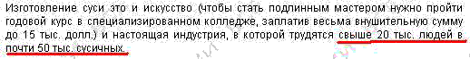 Видали как тяжело приходится простым сусидельцам? В каждой сусечной, как показывает несложный расчет, работает примерно по 0.5 работника. А ему ведь приходится обслуживать несколько человек. Теперь я понимаю, почему эти суси они готовить не успевают, а так и подают - сырыми.