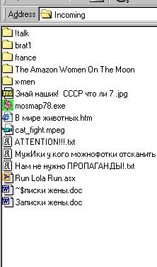 Alekz прислал мне инкаминг видео сервера МФТИ. Вроде, ничего особенного, но темп-файл, созданный Word-ом из моих "Записок жены программиста" выглядит как-то очень подозрительно. Впрочем, я всегда подозревал, что Microsoft ко мне плохо относится. Все никак не могут простить программную статью "Как правильно мучить Windows95":